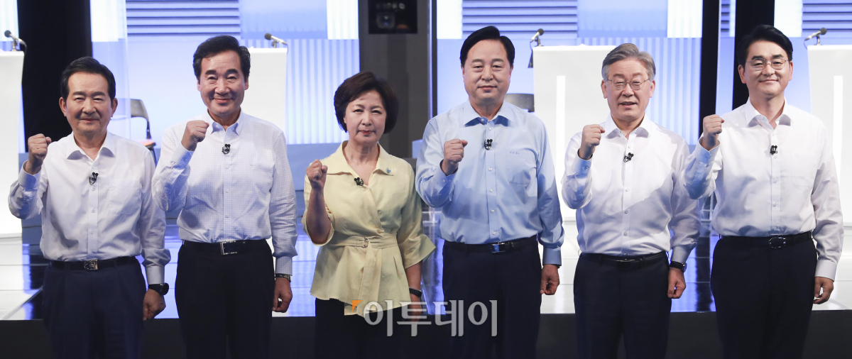 정세균(왼쪽부터), 이낙연, 추미애, 김두관, 이재명, 박용진 더불어민주당 대선 경선 후보가 4일 오후 서울 마포구 상암동 YTN에서 열린 대선 후보자 토론회를 앞두고 기념촬영을 하고 있다. 국회사진취재단