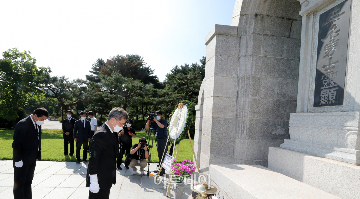 국민의힘 대선 예비후보로 첫 공식일정을 시작한 최재형 전 감사원장이 5일 오전 서울 동작구 국립서울현충원 무명용사의 묘역에 참배를 하고 있다. 국회사진취재단