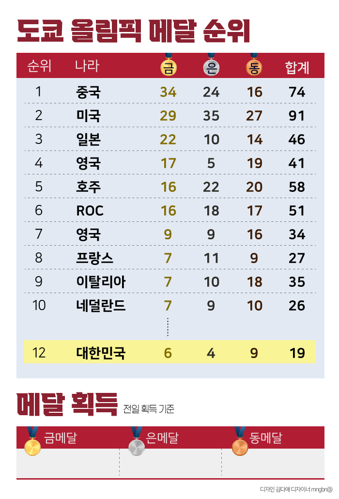 2020 도쿄올림픽 15일 차, 국가별 메달 순위를 보면 중국이 금메달 34개, 은메달 24개, 동메달 16개로 종합순위 1위를 기록했다. 대한민국은 금메달 6개, 은메달 4개, 동메달 9개로 종합순위 12위에 올라있다.