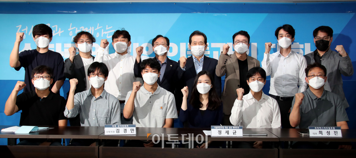 민주당 대권 후보인 정세균 전 국무총리(뒷줄왼쪽다섯번째)가 6일 오전 여의도 용산빌딩에서 열린 '대한민국 스타트업 기업인들과의 대화'에 앞서 기념사진을 찍고 있다.