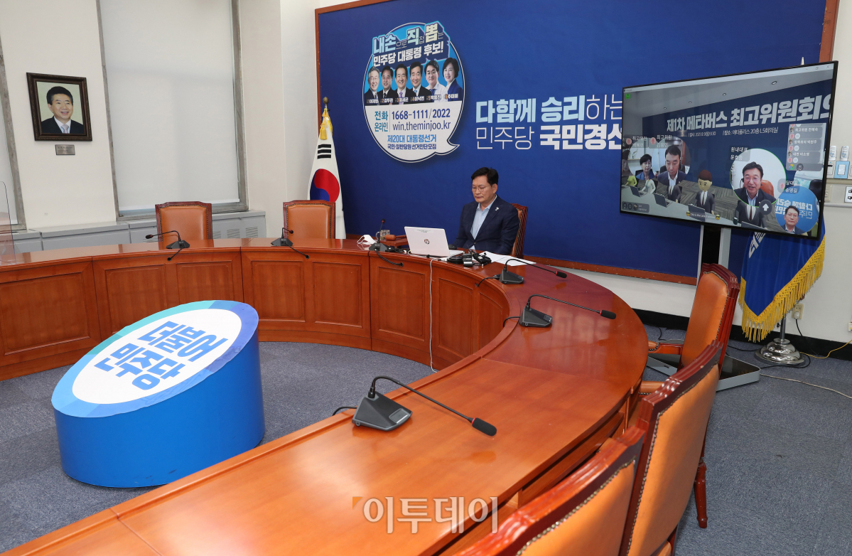 송영길 더불어민주당 대표가 9일 오전 서울 여의도 국회에서 열린 제1차 메타버스 최고위원회의에서 윤호중 원내대표의 모두발언을 듣고 있다.