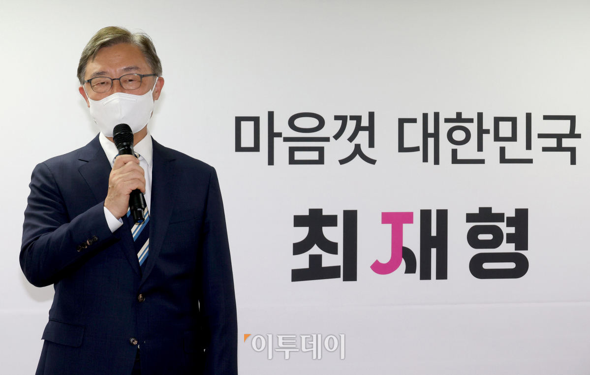 최재형 국민의힘 대선 예비후보가 9일 오전 서울 여의도 대하빌딩 선거사무실에서 열린 선거대책회의를 주재하며 인사말을 하고 있다.
