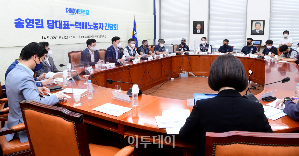 송영길 더불어민주당 대표가 9일 서울 여의도 국회에서 열린 택배노동자와의 간담회에서 모두발언을 하고 있다.
