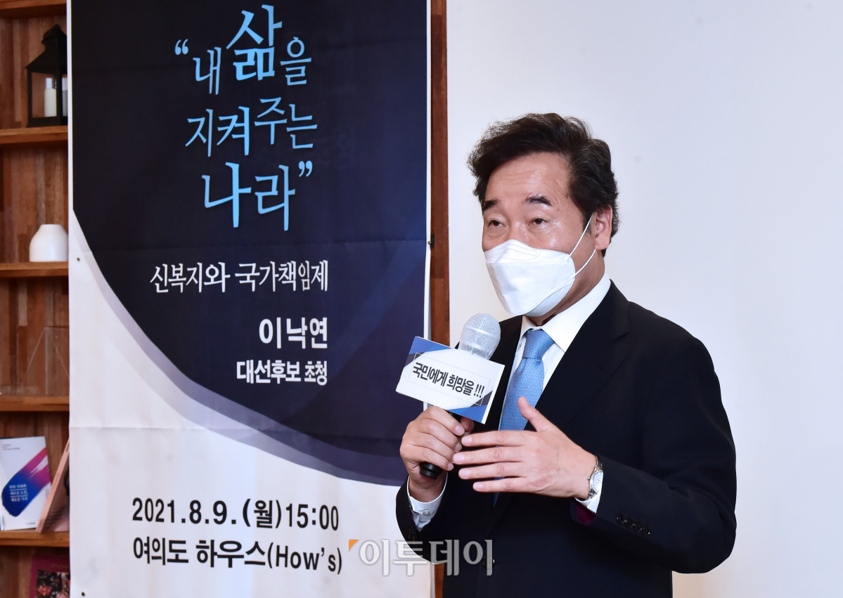 제20대 대선 더불어민주당 대선 경선 후보인 이낙연 전 더불어민주당 대표(의원)가 9일 서울 영등포구 국회대로 하우스카페에서 열린 한국 사회복지시설단체협의회 간담회에 참석, 신복지와 국가책임제 관련 본인의 생각을 전하고 있다.