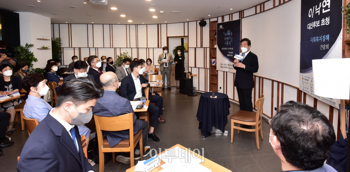 제20대 대선 더불어민주당 대선 경선 후보인 이낙연 전 더불어민주당 대표(의원)가 9일 서울 영등포구 국회대로 하우스카페에서 열린 한국 사회복지시설단체협의회 간담회에 참석, 신복지와 국가책임제 관련 본인의 생각을 전하고 있다.