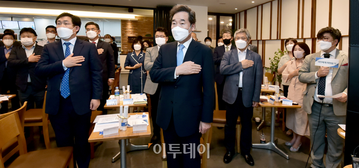 제20대 대선 더불어민주당 대선 경선 후보인 이낙연 전 더불어민주당 대표(의원)가 9일 서울 영등포구 국회대로 하우스카페에서 열린 한국 사회복지시설단체협의회 간담회에 참석, 국민의례를 갖고 있다.