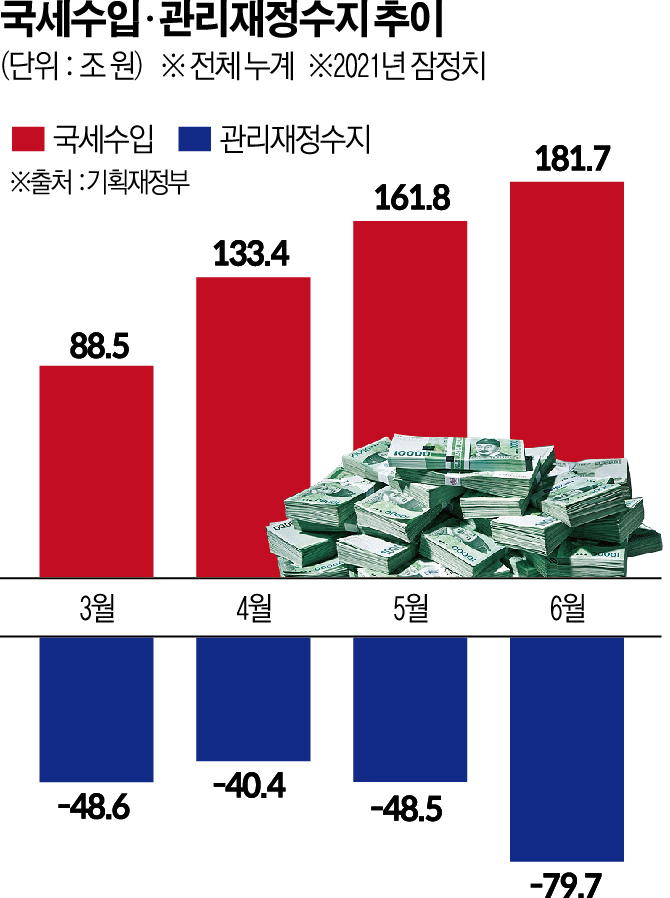 빠른 경기회복 흐름에 부동산·주식시장 등 호조까지 더해지면서 올해 1~6월 정부가 거둬들인 세수가 전년보다 48조원 넘게 증가했다. 세금 등이 더 걷히면서 재정수지 적자는 전년대비 절반수준으로 크게 감소했다.