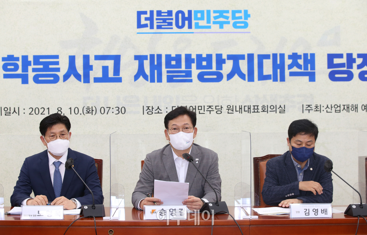더불어민주당 송영길 대표가 10일 오전 서울 여의도 국회에서 열린 광주 학동 사고 재발방지대책 당정협의에서 모두발언을 하고 있다.