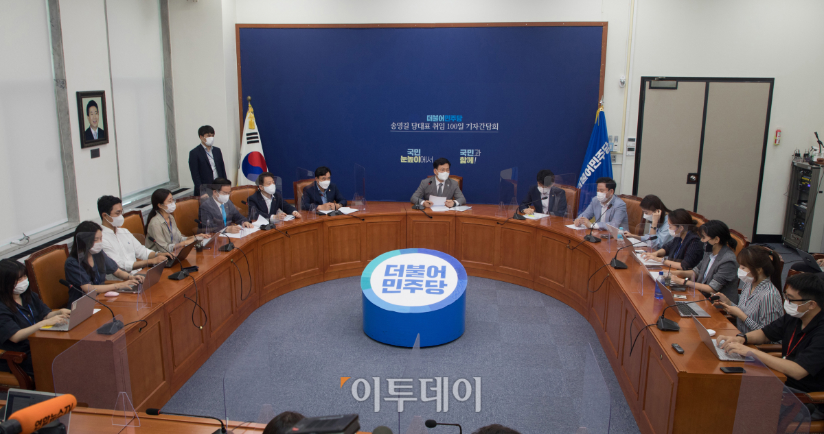 10일 오전 국회 더불어민주당 대표실에서 송영길 당대표가 취임 100일 기자간담회를 하고 있다. 송대표가 기자들의 질문에 답하고 있다.