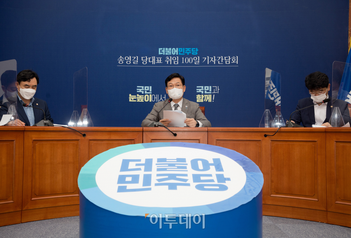 더불어민주당 송영길 대표가 10일 오전 국회 당대표 회의실에서 열린 취임 100일 기자간담회에서 소회를 밝히고 있다.