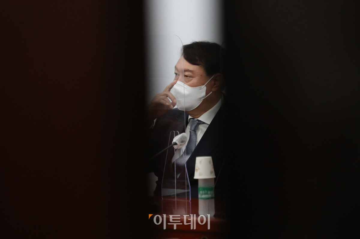 국민의힘 윤석열 대선 예비후보가 11일 오전 서울 여의도 국회에서 열린 ‘더 큰 국민의힘 재선의원 간담회’에 참석해 있다. 이날 간담회는 윤 후보의 모두발언 후 비공개로 전환됐다.