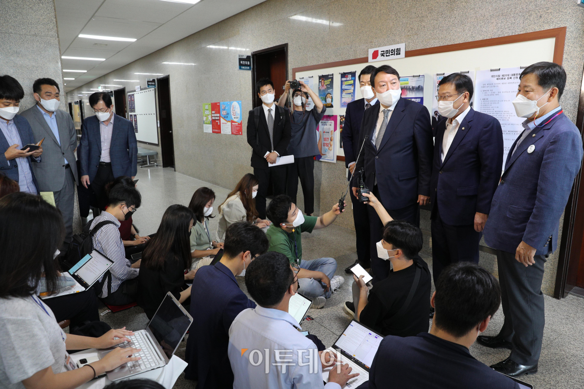 윤석열 전 검찰총장이 11일 오전 국회에서 열린 국민의힘 재선 의원들과 간담회를 마친 뒤 기자들의 질문(백 브리핑)에 답하고 있다.
