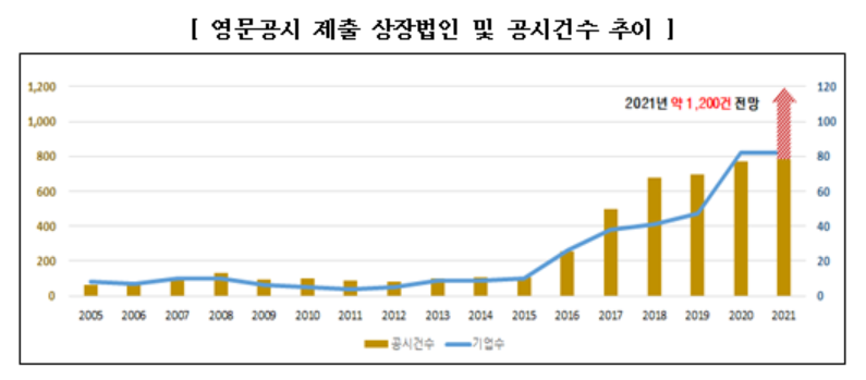 코스피 시장 상장법인이 제출한 영문공시는 2015년까지 연 100건 수준에서 점차 증가해 2018년 이후 연 700건 수준에 도달했다. 지난해 하반기부터는 크게 증가해 올해 약 1200건 이상이 될 것으로 예상된다.