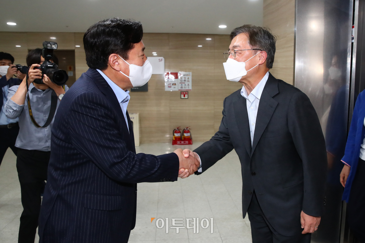 국민의힘 대권주자인 최재형 전 감사원장(오른쪽)이 12일 서울 여의도 중소기업중앙회를 방문해 김기문 중소기업중앙회 회장과 인사하고 있다.