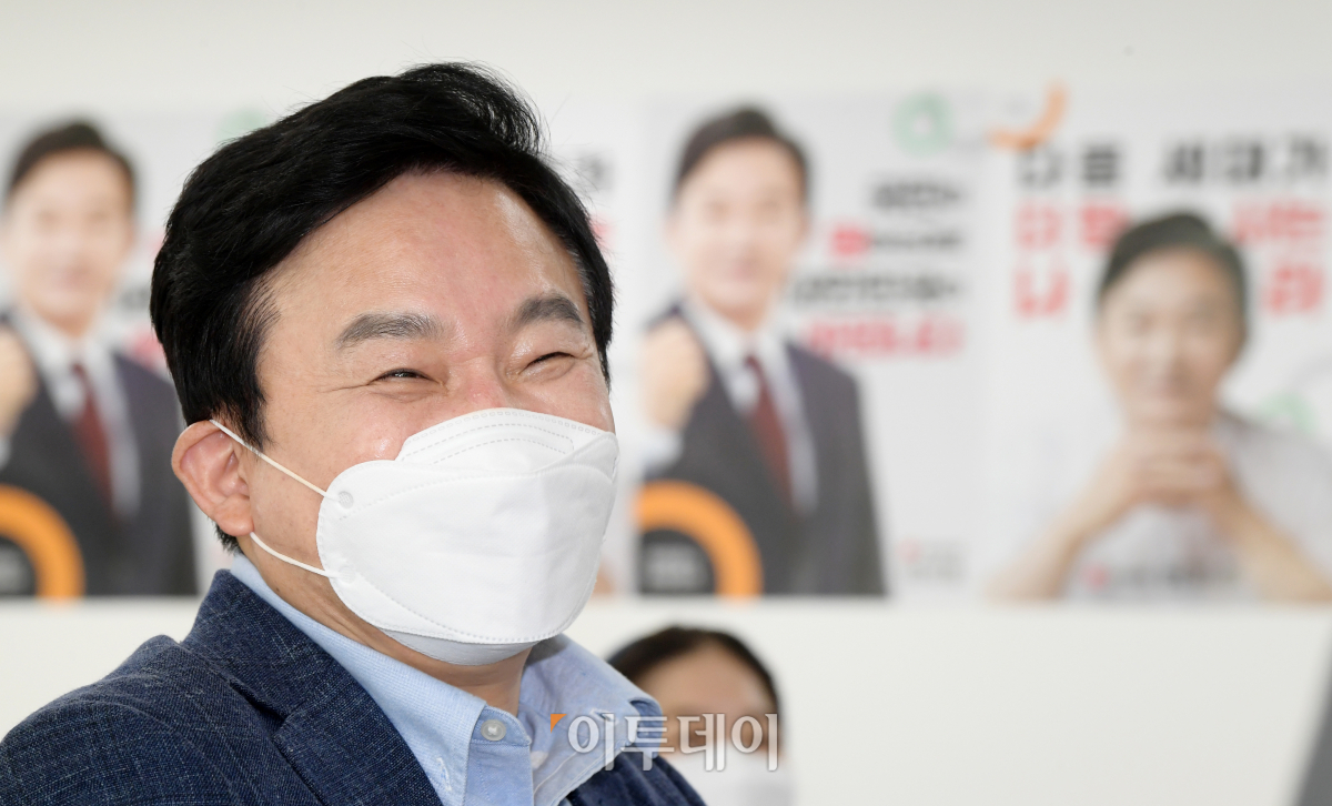 국민의힘 대선 예비후보인 원희룡 전 제주지사가 12일 오후 서울 영등포구 용산빌딩에 위치한 캠프 사무실에서 '원희룡의 원팀캠프 데이' 기자간담회를 갖고 취재진의 질문을 들으며 웃고 있다.