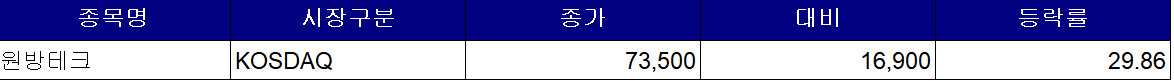 코스닥 종목 중 원방테크는 전일 대비 29.86%(1만6900원) 오른 7만3500원에 장을 마치며 이틀 연속 상한가를 달성했다.