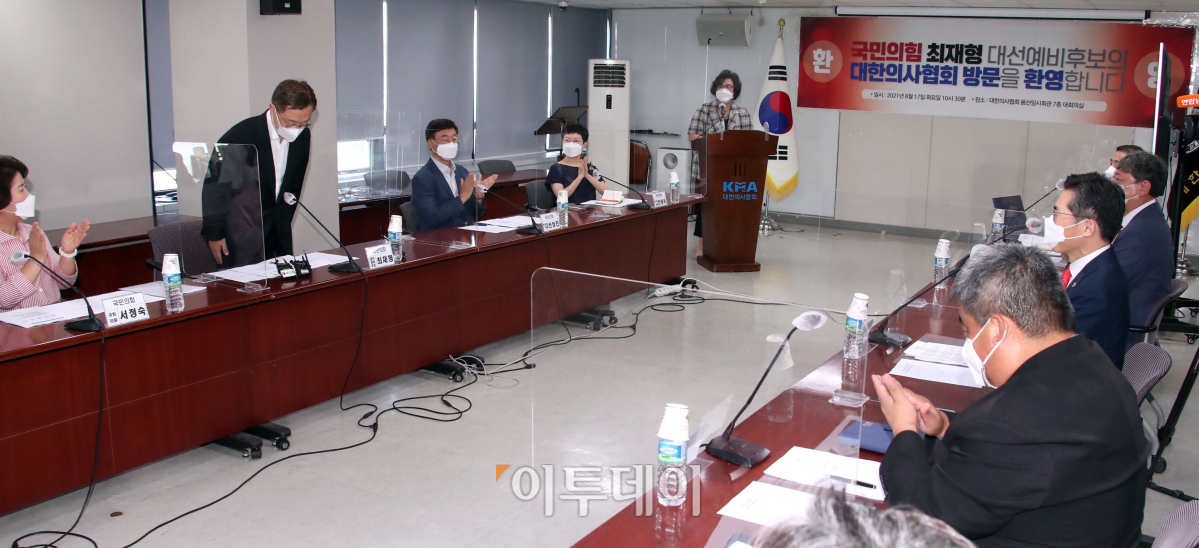 국민의힘 대권 주자인 최재형 전 감사원장(왼쪽두번째)이 17일 오전 서울 용산구 대한의사협회에서 열린 코로나19 방역 대책 등에 대한 간담회에서 인사하고 있다. 국회사진취재단
