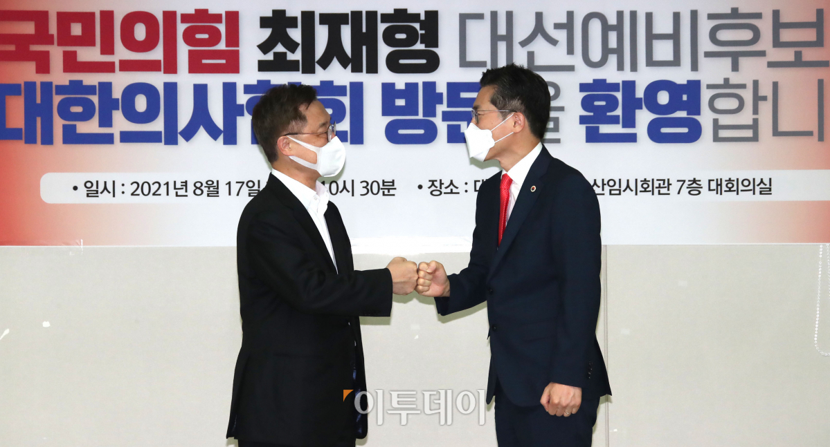 국민의힘 대권 주자인 최재형 전 감사원장(왼쪽)이 17일 오전 서울 용산구 대한의사협회에서 열린 코로나19 방역 대책 등에 대한 간담회에 앞서 이필수 대한의사협회 회장과 인사하고 있다. 국회사진취재단