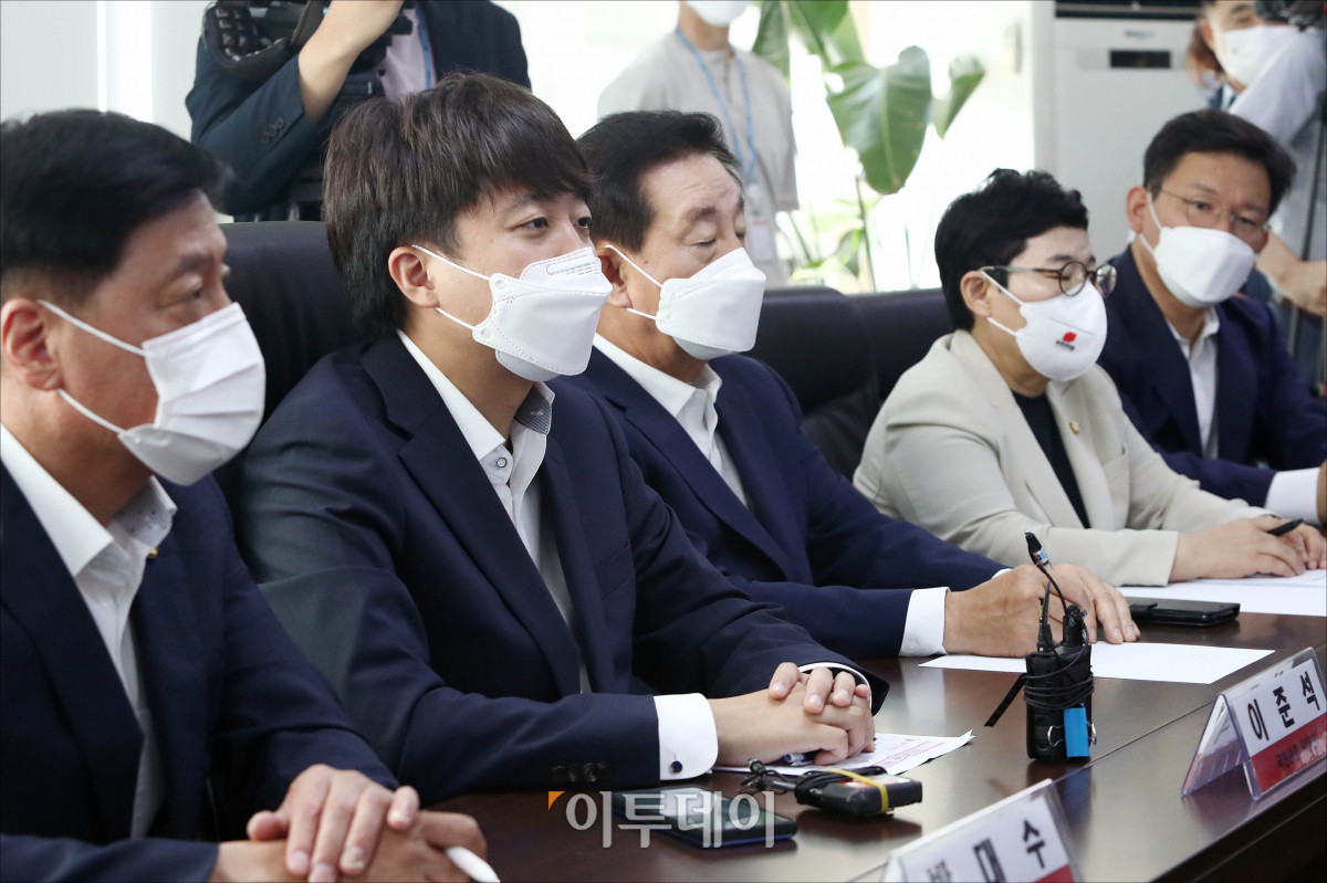 이준석 국민의힘 대표가 17일 오전 서울 여의도 한국노동조합총연맹(한국노총)을 방문해 가진 간담회에서 인사말을 하고 있다.