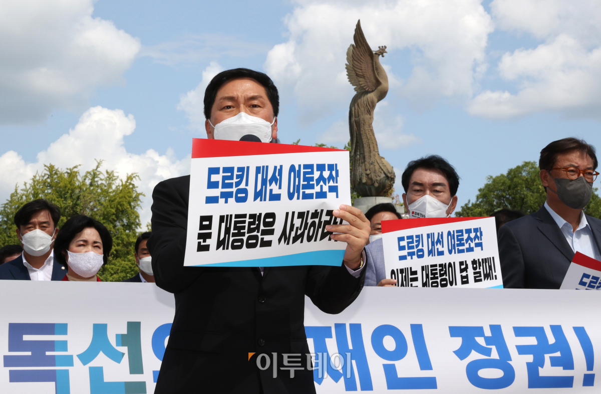 17일 오후 서울 종로구 청와대 분수대 앞에서 열린 국민의힘 긴급의원총회에서 김기현 원내대표가 발언하고 있다. 국회사진취재단