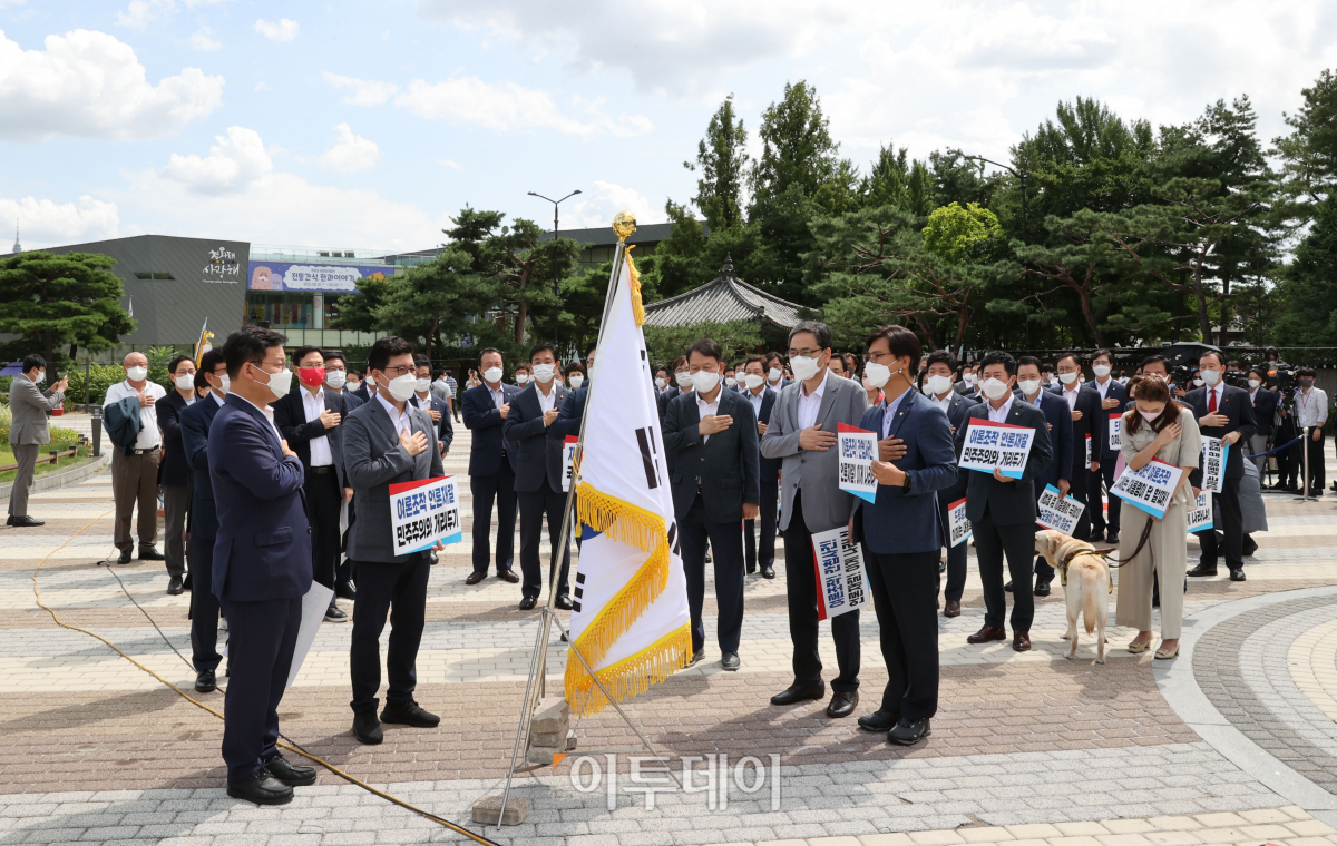 [포토] 청와대앞 의원총회, 국민의례하는 국민의힘 의원들