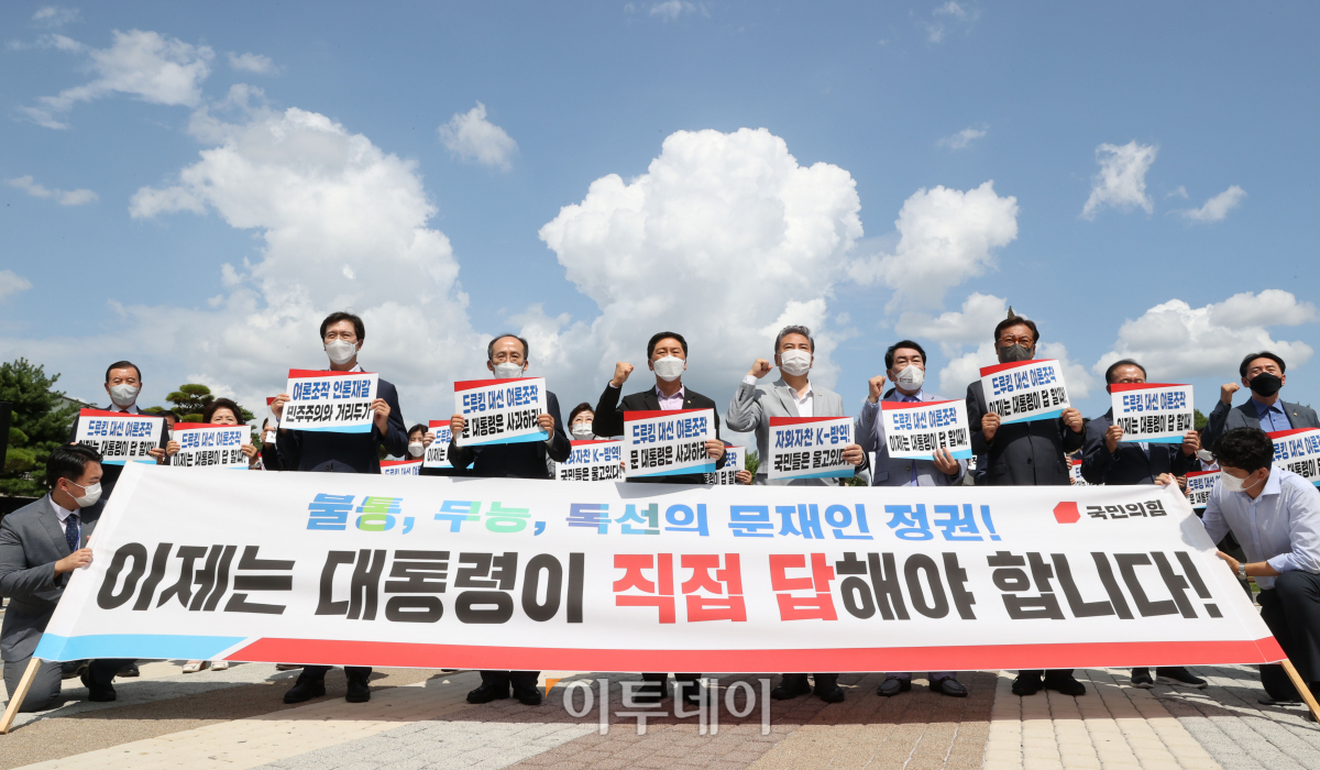 김기현 국민의힘 원내대표를 비롯한 의원들이 17일 오후 서울 종로구 청와대 분수대 앞에서 열린 국민의힘 긴급의원총회에서 구호를 외치고 있다. 국회사진취재단