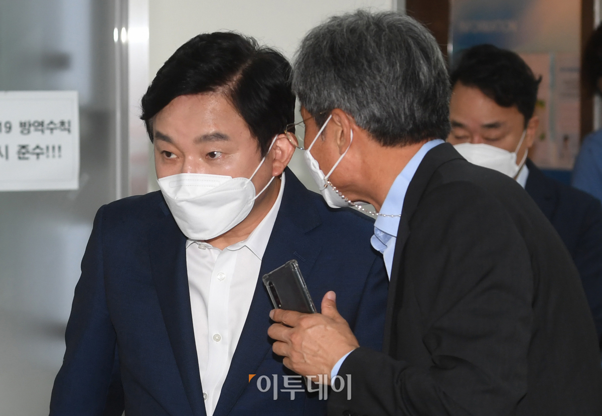 국민의힘 대권주자인 원희룡 전 제주지사가 18일 오전 서울 여의도 국민의힘 중앙당사에서 국민의힘 이준석 대표의 ‘윤석열 전 검찰총장은 금방 정리된다’ 발언에 맞대응하는 긴급 기자회견을 하기위해 들어서며 경윤호 공보단장과 대화하고 있다.