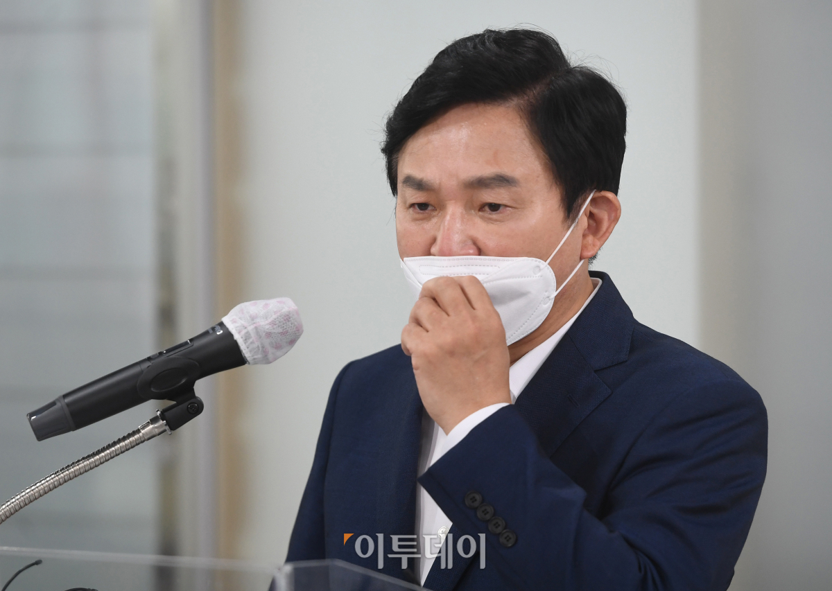 국민의힘 대권주자인 원희룡 전 제주지사가 18일 오전 서울 여의도 국민의힘 중앙당사에서 국민의힘 이준석 대표의 ‘윤석열 전 검찰총장은 금방 정리된다’ 발언에 맞대응하는 긴급 기자회견을 열고 “오늘 오후 6시까지 자신과 통화한 녹음 파일 전체를 공개하라”고 요구하고 있다.