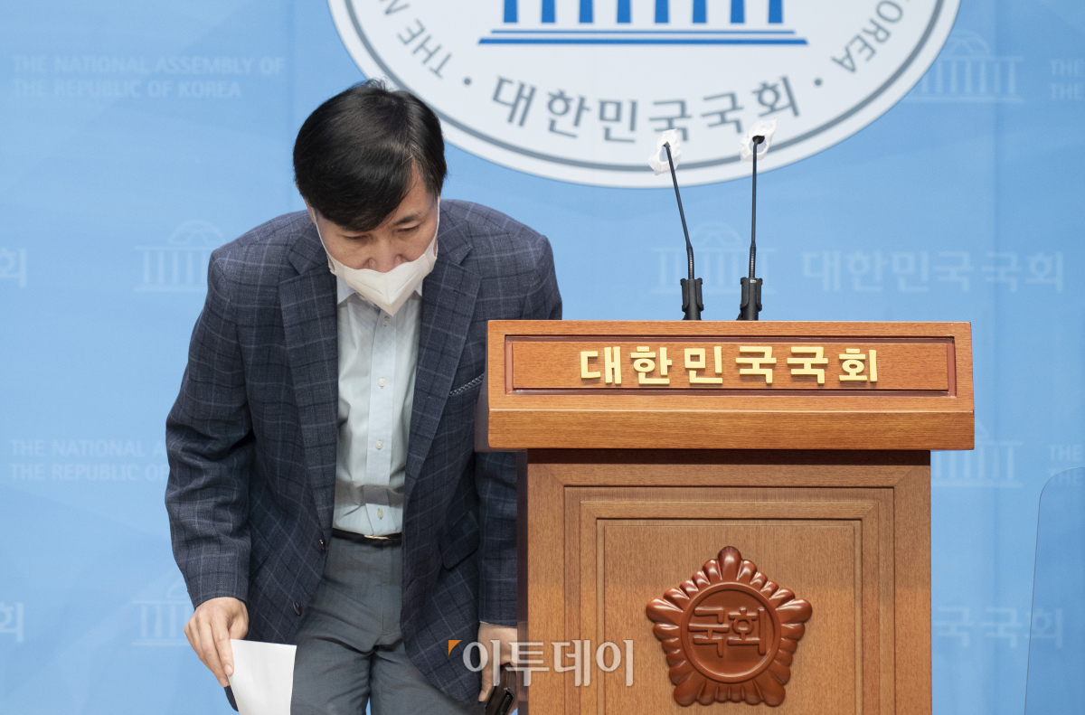 국민의힘 하태경 의원이 18일 오전 서울 여의도 국회 소통관에서 원희룡 후보 사퇴 촉구 기자회견을 마친 뒤 인사하고 있다.