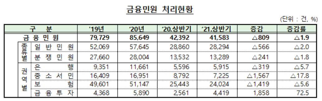 2021년 상반기 중 금융민원 처리건수는 4만1583건으로 전년 동기 대비 1.9%(809건) 줄었다.