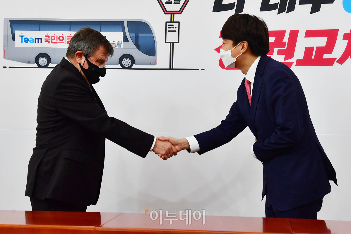 국민의힘 이준석 대표가 18일 국회를 찾은 안드레이 쿨릭 주한 러시아 대사를 만나며 악수를 하고 있다.