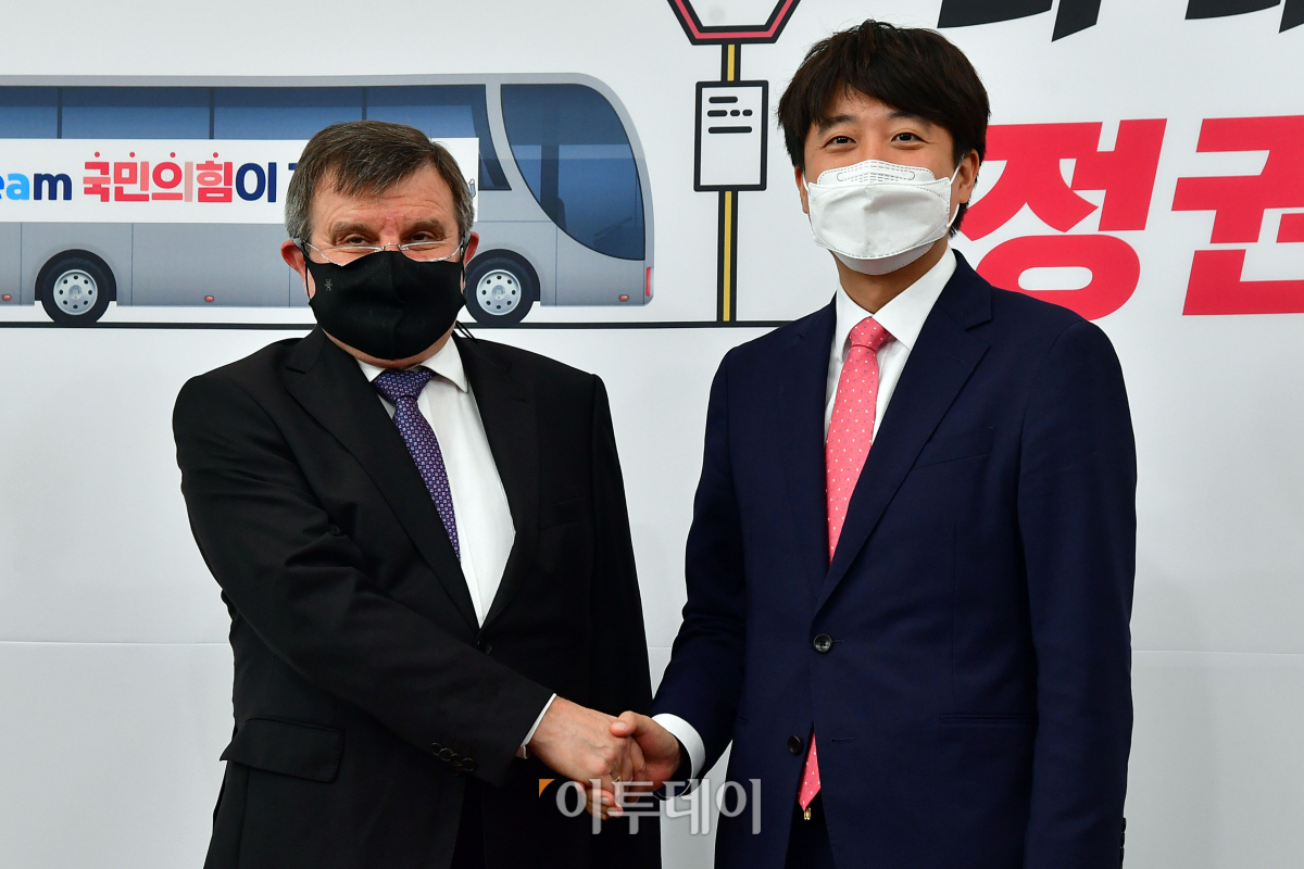 국민의힘 이준석 대표가 18일 국회를 찾은 안드레이 쿨릭 주한 러시아 대사를 만나며 악수를 하고 있다.