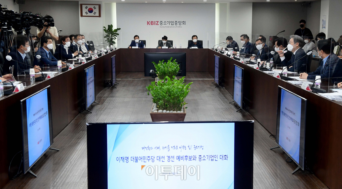 더불어민주당 대선 경선 예비후보인 이재명 경기지사가 19일 서울 여의도 중소기업중앙회에서 대·중소기업 양극화 실태와 중소기업 현안 과제를 주제로 열린 ‘이재명 후보와 중소기업인 대화’에서 인사말을 하고 있다.