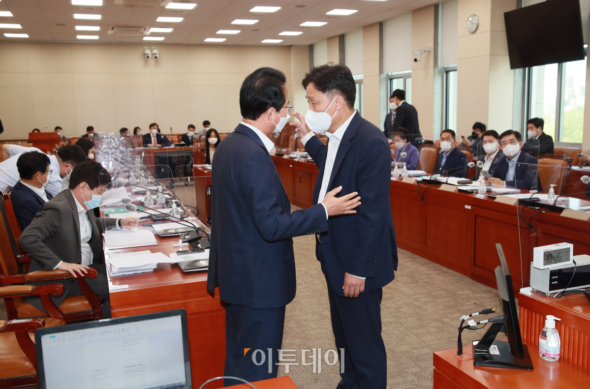김영진(오른쪽) 기재위 소위원장과 류성걸 국민의힘 의원이 19일 오전 서울 여의도 국회에서 열린 기획재정위원회 소위원회에서 대화하고 있다.