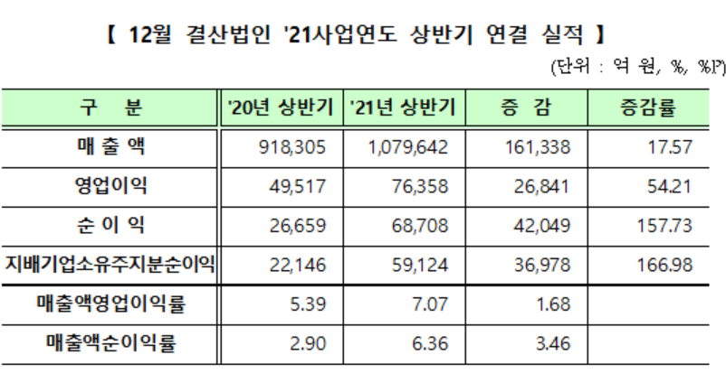 같은 기간 개별 기준 1478사 중 비교가 가능한 1277 매출액은 총 74조4756억 원으로 12.82%, 영업이익은 5조8115억 원으로 33.59%, 순이익은 5조6060억 원으로 86.64% 늘었다.