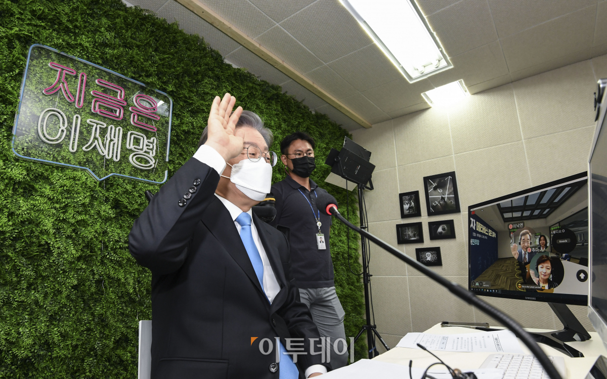 이재명 경기도지사가 20일 서울 여의도 선거캠프에서 화상으로 더불어민주당 메타버스 캠프 입주식에 참가하고 있다.