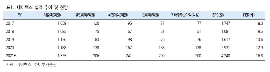 이상헌 하이투자증권 연구원은 "테이팩스는 2차전지, 디스플레이, 스마트폰, 반도체 공정에서 핵심소재로 사용되는 전자재료용 테이프, 식품 포장용 랩, 친환경 소비재 상품까지 안정적인 사업 포트폴리오를 구축하고 있다"고 평가했다.