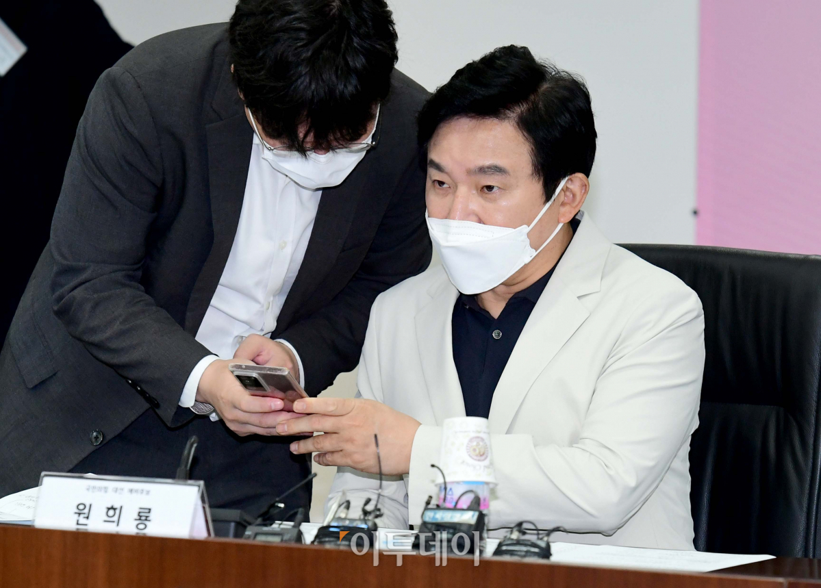 국민의힘 대선 예비후보인 원희룡 전 제주지사가 23일 서울 여의도 중소기업중앙회에서 대·중소기업 양극화 실태와 중소기업 현안 과제를 주제로 열린 ‘원희룡 후보와 중소기업인 대화’에 앞서 관계자의 보고를 받고 있다.