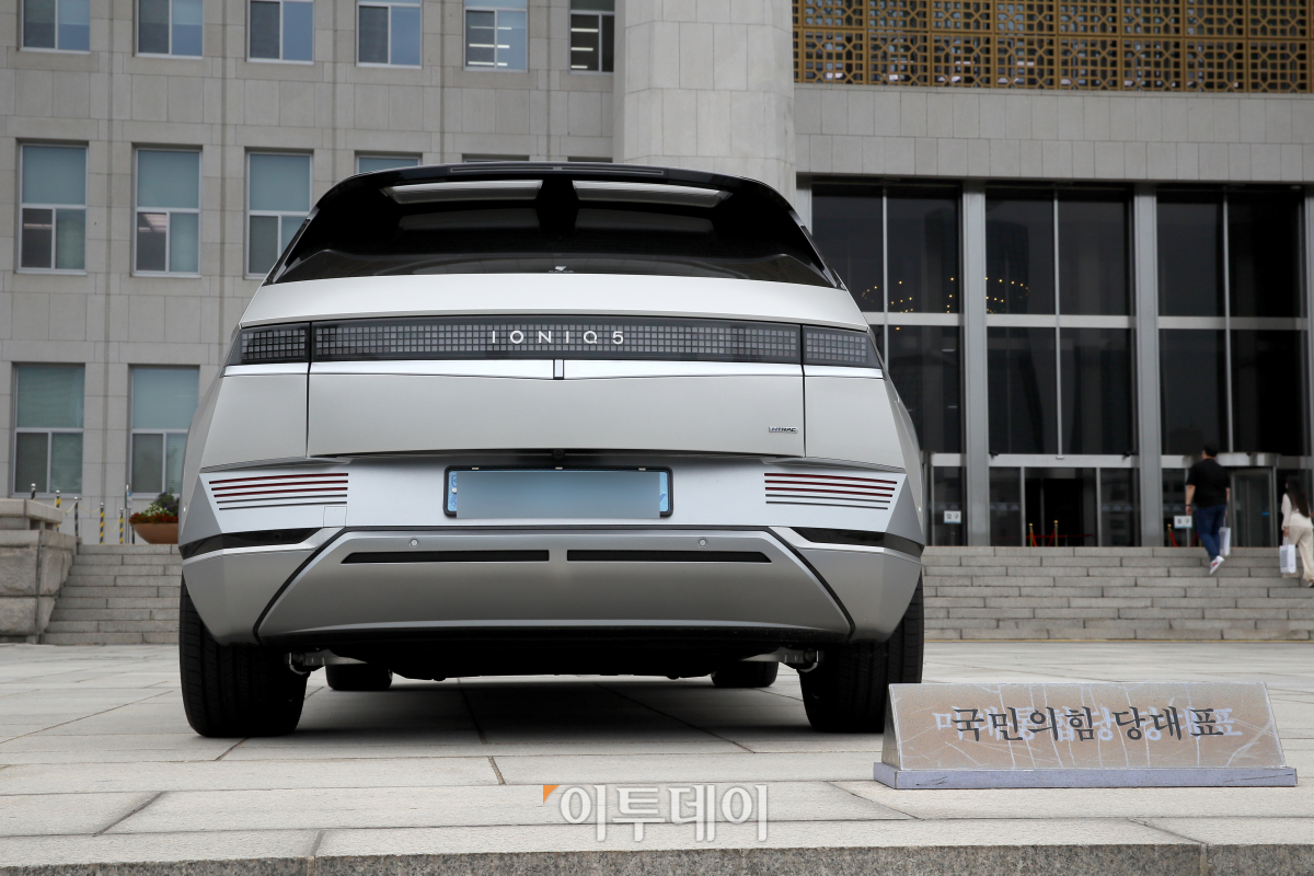 국민의힘 이준석 대표의 신차 아이오닉5가 23일 국회 본청 앞 주차구역의 '국민의힘 당대표' 표지석 앞에 주차돼 있다.