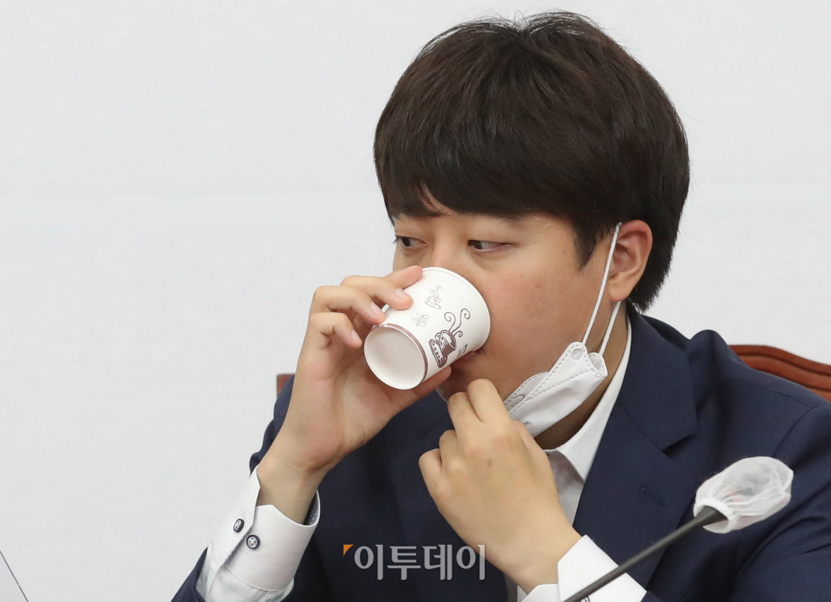 이준석 국민의힘 대표가 23일 오전 서울 여의도 국회에서 열린 최고위원회의에서 모두발언 후 물을 마시고 있다.