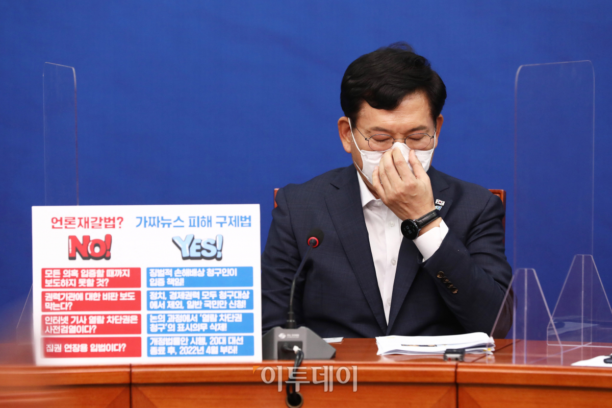 더불어민주당 송영길 대표가 23일 오전 국회에서 열린 최고위원회의에서 마스크를 고쳐쓰고 있다.