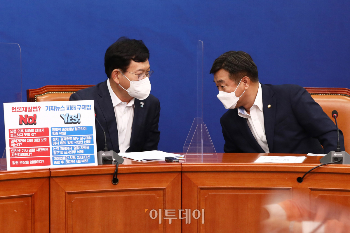 더불어민주당 송영길 대표와 윤호중 원내대표가 23일 오전 국회에서 열린 최고위원회의에서 대화를 나누고 있다.