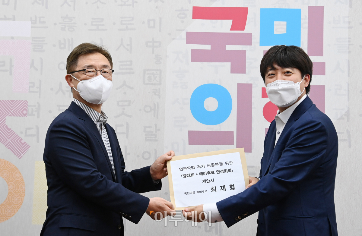 23일 오전 최재형 국민의힘 대선예비후보가 언론악법 저지공동투쟁을 위한 ‘당대표-대선예비후보 연석회의’ 제안서를 이준석 당대표에게 전달하고 있다.