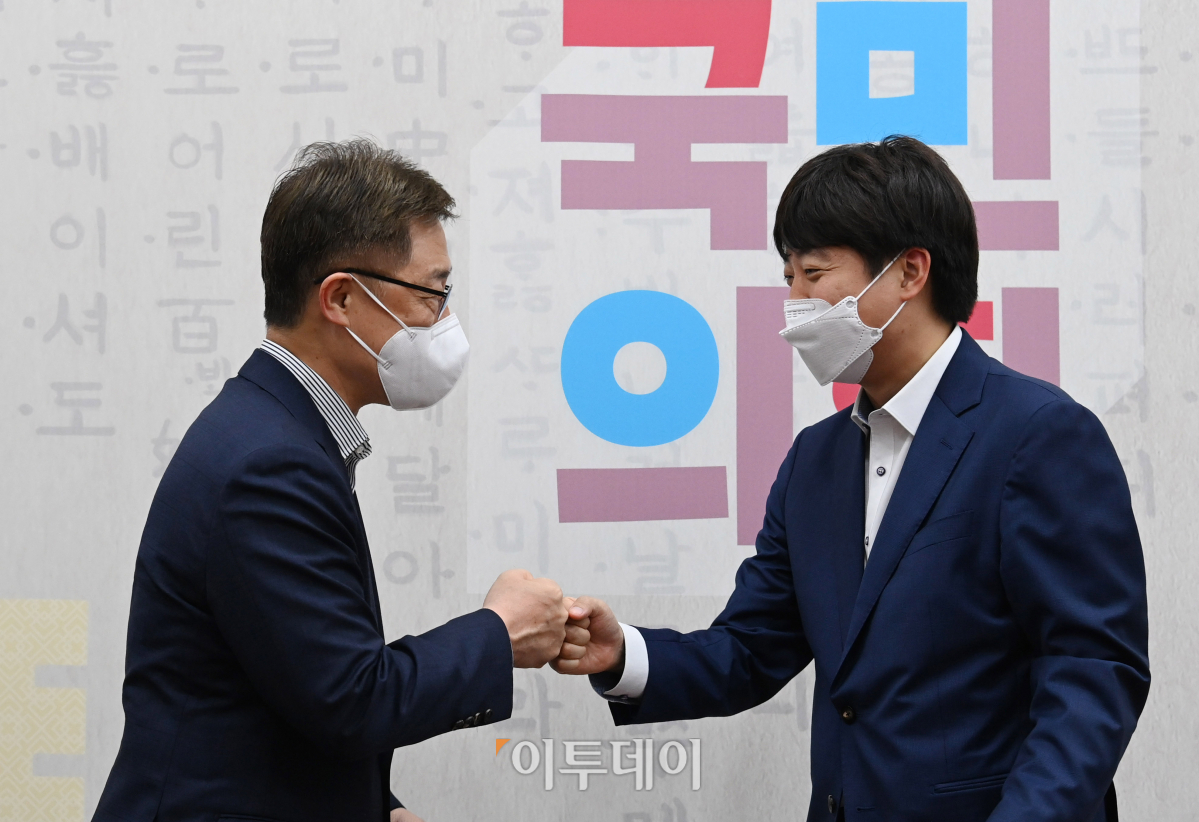 23일 오전 최재형 국민의힘 대선예비후보가 언론악법 저지공동투쟁을 위한 ‘당대표-대선예비후보 연석회의’ 제안서를 이준석 당대표에게 전달하기에 앞서 주먹인사를 나누고 있다.