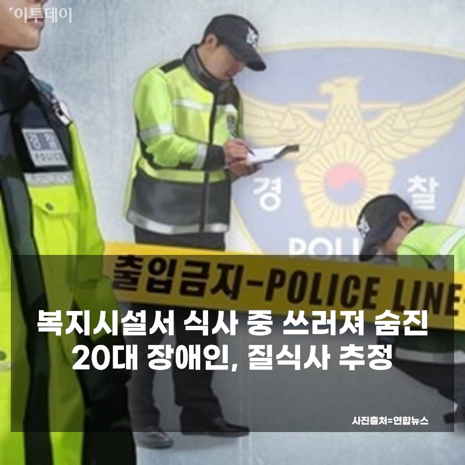23일 인천 연수경찰서는 지난 6일 인천시 연수구 한 장애인 복지시설에서 식사 중 쓰러져 숨진 20대 장애인 A 씨의 시신을 국립과학수사연구원에 부검 의뢰한 결과 “질식사로 추정된다”는 소견을 전달받았다고 밝혔습니다.