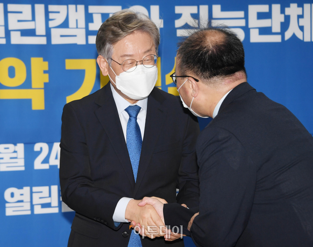 더불어민주당 대선 예비후보인 이재명 경기지사가 24일 여의도 선거캠프에서 열린 직능단체와의 정책협약 기념식에 참석해 인사를 나누고 있다.