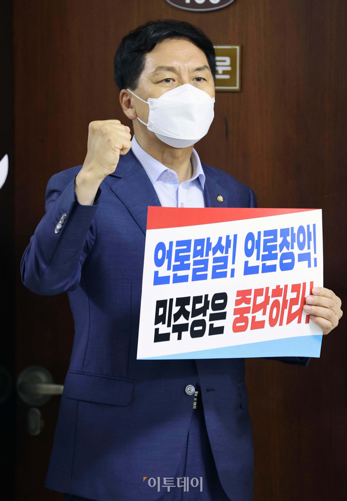 김기현 국민의힘 원내대표가 24일 서울 여의도 국회 법사위 회의실 앞에서 여당의 언론중재법 강행을 규탄하는 팻말을 들고 구호를 외치고 있다.