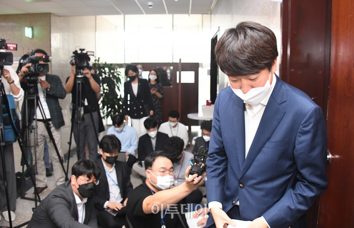 국민의힘 이준석 당 대표가 24일 서울 여의도 국회에서 열린 비공개 최고위원회의 결과를 브리핑후 자리를 떠나고 있다. 이날 최고위원회의에서는 전날 국민권익위원회가 발표한 국민의힘 국회의원 12명 부동산 거래 법령위반 의혹 관련 명단 공개 및 처분 수위 등을 논의했다.