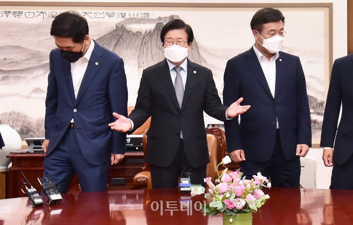 박병석 국회의장을 비롯해 윤호중 더불어민주당 원내대표, 김기현 국민의힘 원내대표 등 여야 원내대표가 25일 서울 여의도 국회 의장실에서 구글 갑질방지법·수술실 CCTV 설치법·언론중재법 개편안 등 본회의 일정 논의 관련 회동을 갖고 있다.