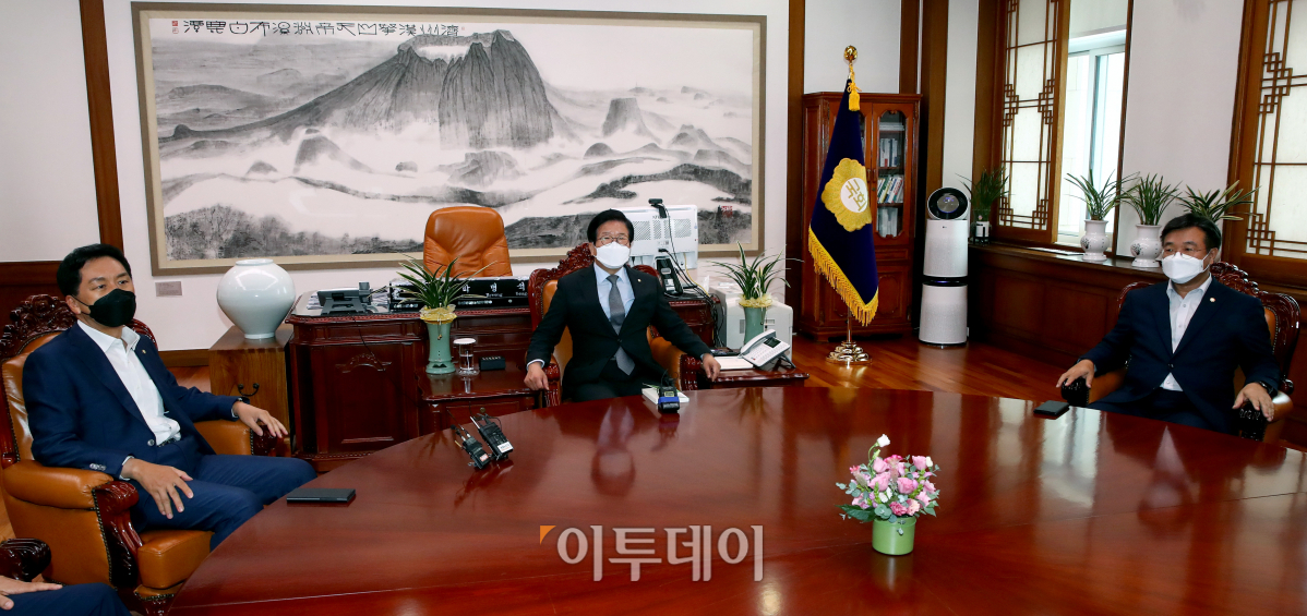 박병석 국회의장을 비롯해 윤호중 더불어민주당 원내대표, 김기현 국민의힘 원내대표 등 여야 원내지도부가 25일 서울 여의도 국회 의장실에서 구글 갑질방지법·수술실 CCTV 설치법·언론중재법 개편안 등 본회의 일정 논의 관련 회동을 갖고 있다.